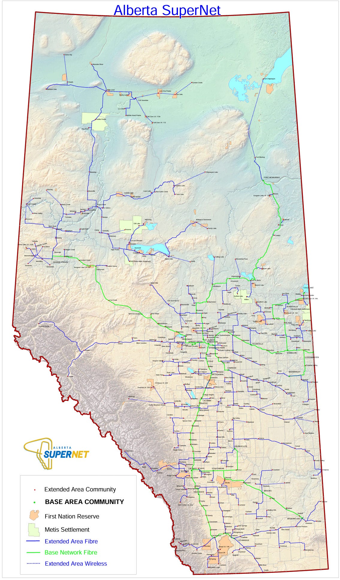 A good example of an “endowment” from Alberta endowment is the province’s SuperNet, a 13,000 km fiber-optic and wireless network connecting 429 communities (see the map below).