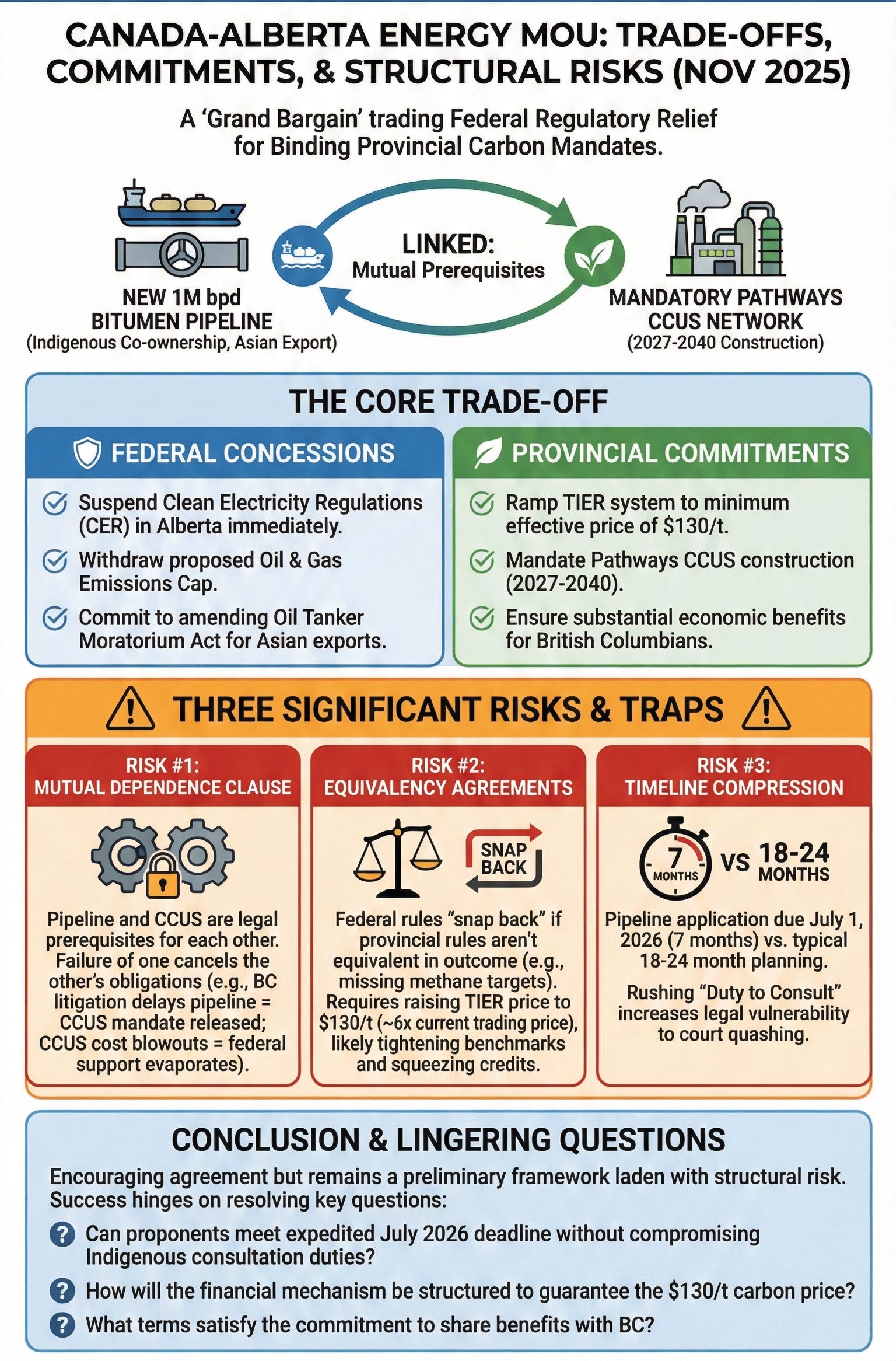 Prime Minister Mark Carney and Alberta Premier Danielle Smith signed a memorandum of understanding (MOU) today composed of a trade-off between Federal regulatory relief and binding Provincial carbon mandates.