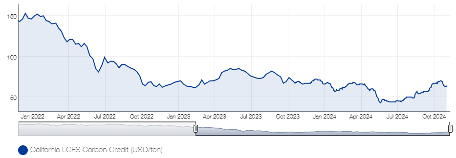 • LCFS prices have dropped to approximately $65, down significantly from around $150 in 2022, mainly due to an increase in renewable diesel supply. Many anticipated that regulatory revisions would be approved to help alleviate the supply surplus and bring balance back to the LCFS market.