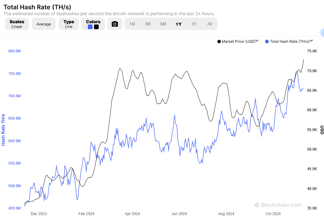 Notice that hashrate (a measure of computational power used in crypto-mining) has risen alongside prices through 2024.