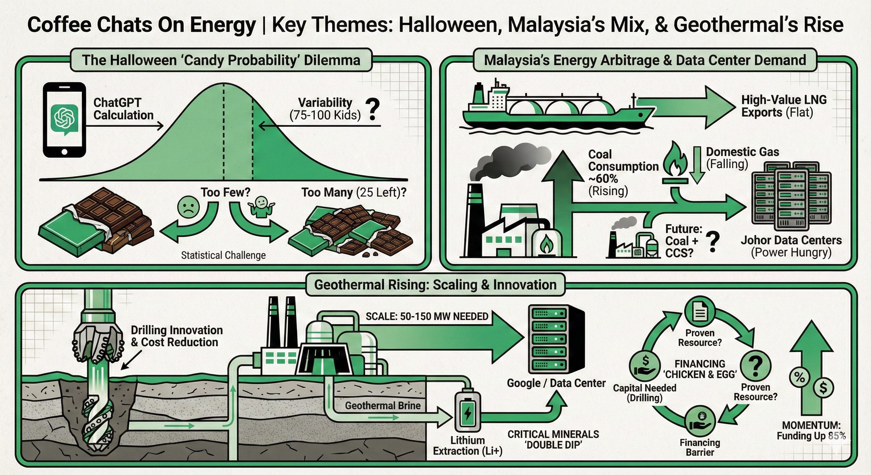In this episode, the hosts catch up just before Halloween, discussing costume plans and the statistical dilemma of how much candy to buy for a new neighborhood. The conversation then pivots to global energy markets, analyzing a recent report on Malaysia’s strategy to increase domestic coal consumption while maintaining high-value LNG exports. Finally, one host reports back from the Geothermal Rising Conference in Reno, sharing critical insights on the industry’s push for larger-scale projects, cost reductions in drilling, and the potential for mineral extraction.