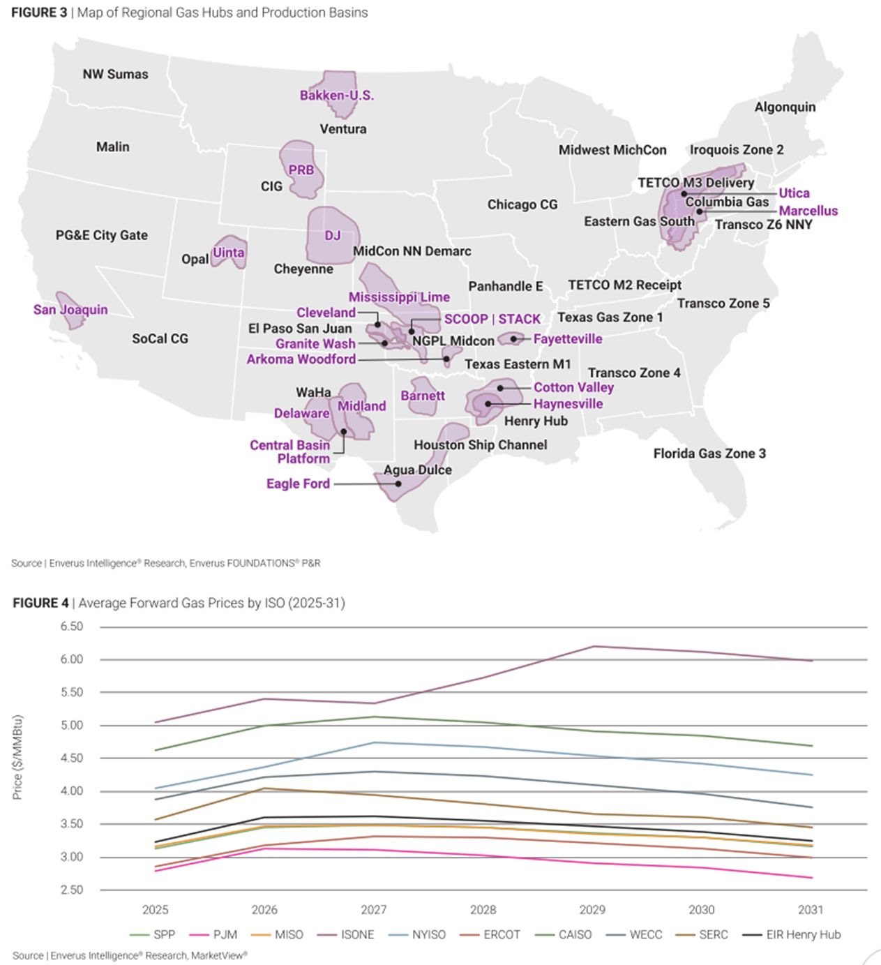 [2] Using seven-year gas price forward curves, our analysis highlights key trends, like ISONE's $6/MMBtu winter price spikes and PJM/ERCOT’s sub-$3/Mcf gas.