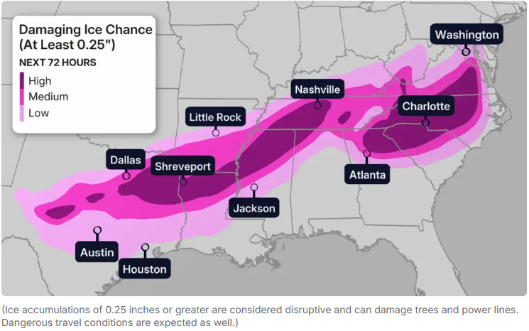 Upstream Freeze-offs: Permian Basin temperatures are low enough to trigger hydration icing at the wellhead and impact fuel supply for gas-fired thermal units. Historical analogs suggest production losses could reach 2–3 Bcf/d, putting immediate pressure on natural gas cash prices (already trading near $18/MMBtu at Henry Hub).