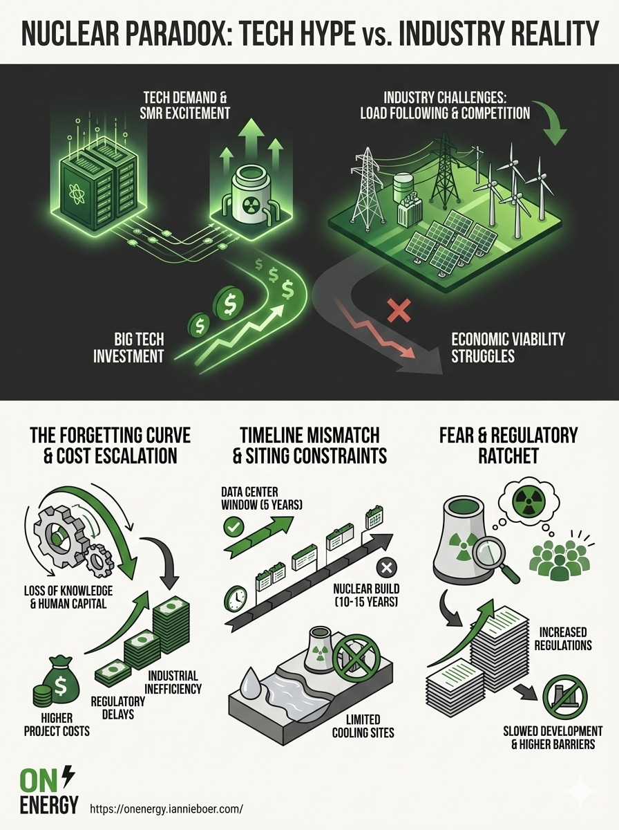 Tech vs. Industry Reality: While big tech is pushing for nuclear to power data centers, industry reports highlight struggles with load following and economic viability against solar and batteries.
