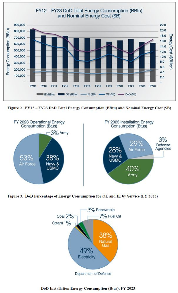 While detailed figures can be hard to find, the U.S. Department of Defense (DoD) publishes an Annual Energy Performance, Resilience, and Readiness Report—and the FY2023 edition offers some insights.