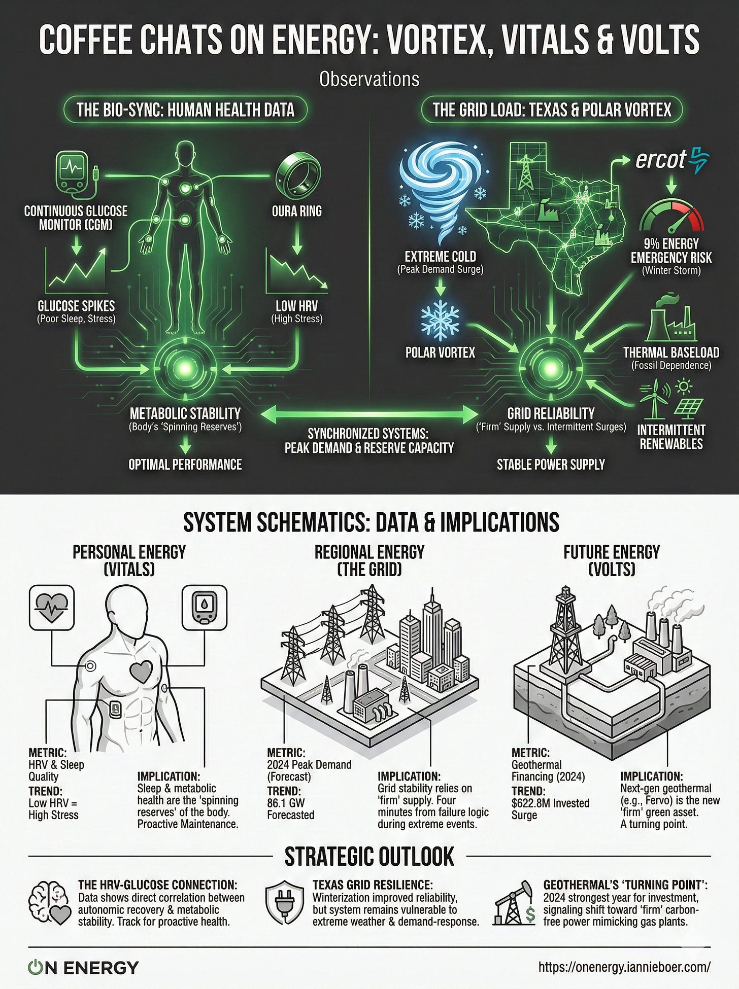 Episode Summary: The hosts discuss the personal insights gained from using continuous glucose monitors (CGMs) and Oura rings to track health metrics like HRV and sleep quality. They also analyze the upcoming “polar vortex” in North America, its potential impact on the Texas power grid, and the recent surge in geothermal energy financing.