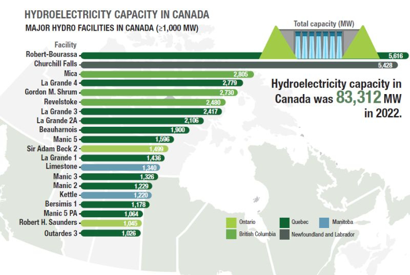 • Total hydro capacity in Canada exceeds 83 GW. For comparison, the US nuclear fleet is about 97 GW (while US hydro capacity is around 102 GW).