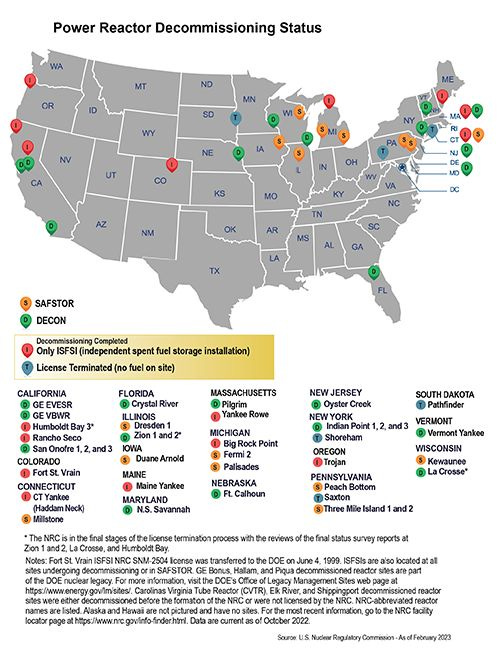 As for Three Mile Island (TMI), its Unit 1 reactor sits next to TMI Unit 2, which infamously shut down in 1979. Unit 2 is currently being decommissioned by Energy Solutions. The map below highlights several U.S. nuclear reactors in various stages of decommissioning, with the TMI site labeled as SAFSTOR, a status that ensures safe storage and future decontamination. Another notable site in SAFSTOR is Holtec International’s Palisades Power Plant, which is also under consideration for a restart.